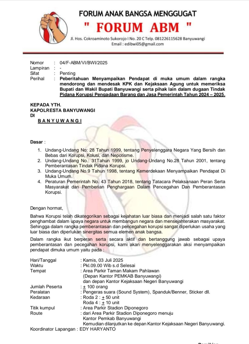 Menelisik kembali isu yang sempat mencuat berkaitan dengan ijon proyek, salah satu aktifis anti korupsi di Banyuwangi yang biasa dipanggil Edy Gempur yang getol menyuarakan perlawanan terhadap korupsi berencana membuat gerakan kata Edy (25 /6/2025 ), Kita memasukan surat pemberitahuan aksi untuk menyuarakan dukungan dan mendesak kepada KPK dan Kejaksaan Agung agar secepatnya mengusut dugaan korupsi yang ada di dalam pemerintahan kabupaten Banyuwangi. Dan kami akan secara masif menyuarakan desakan kepada KPK dan Kejaksaan Agung. Kami juga sudah menyiapkan surat kepada direktorat LHKPN KPK RI untuk memanggil dan meminta klarifikasi kepada beberapa pejabat sentral dan satu mantan kepala daerah yang juga mantan menteri berkaitan dengan LHKPN mereka. Dari informasi masyarakat yang sudah kami tindaklanjuti, kami menemukan indikasi mereka tidak melaporkan beberapa harta yang mereka miliki ke dalam LHKPN, atau dengan kata lain menyembunyikan atau menyamarkan. Kami secara khusus sudah menyiapkan banyak spanduk dan bener dengan tujuan untuk membuka mata dan hati aparat di Kejaksaan Agung dan Komisi Pemberantasan Korupsi untuk tidak tebang pilih, dan menantang untuk membuka korupsi di Banyuwangi yang kami duga terstruktur dan sistematis “, tegas Edy. “Saat ini kami sedang menyiapkan surat terbuka yang kami tujukan kepada Pimpinan KPK dan Jaksa Kejaksaan Agung RI “, pungkas Edy (git)