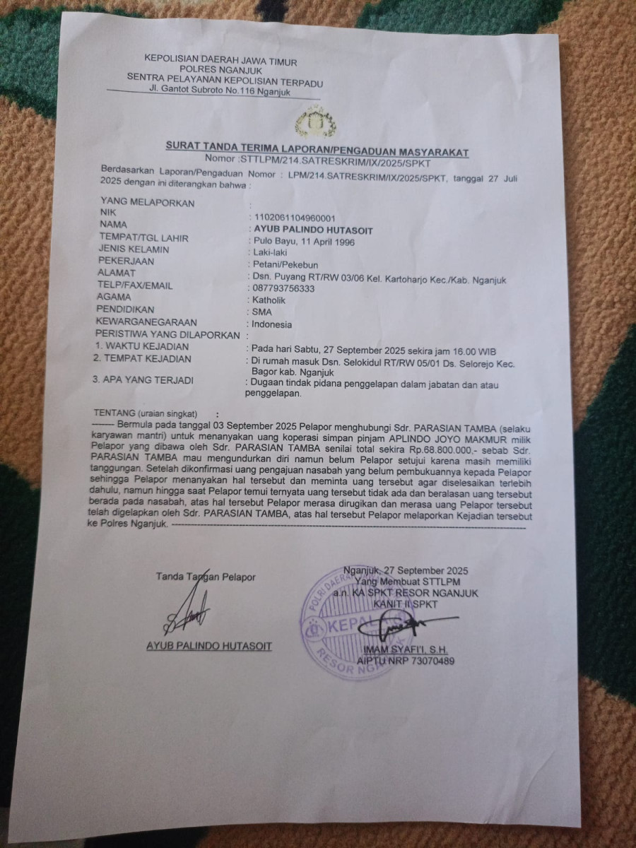 Laporan resmi tersebut disampaikan oleh Ayub Palindo Hutasoit, Direktur/Pemilik KSP AJM, dengan nomor laporan STPL/B/192/IX/2025/SPKT/POLRES NGANJUK/POLDA JAWA TIMUR. Dalam aduannya, Ayub mengungkapkan bahwa terlapor melakukan tindakan di luar aturan resmi koperasi, bahkan melibatkan pihak lain.