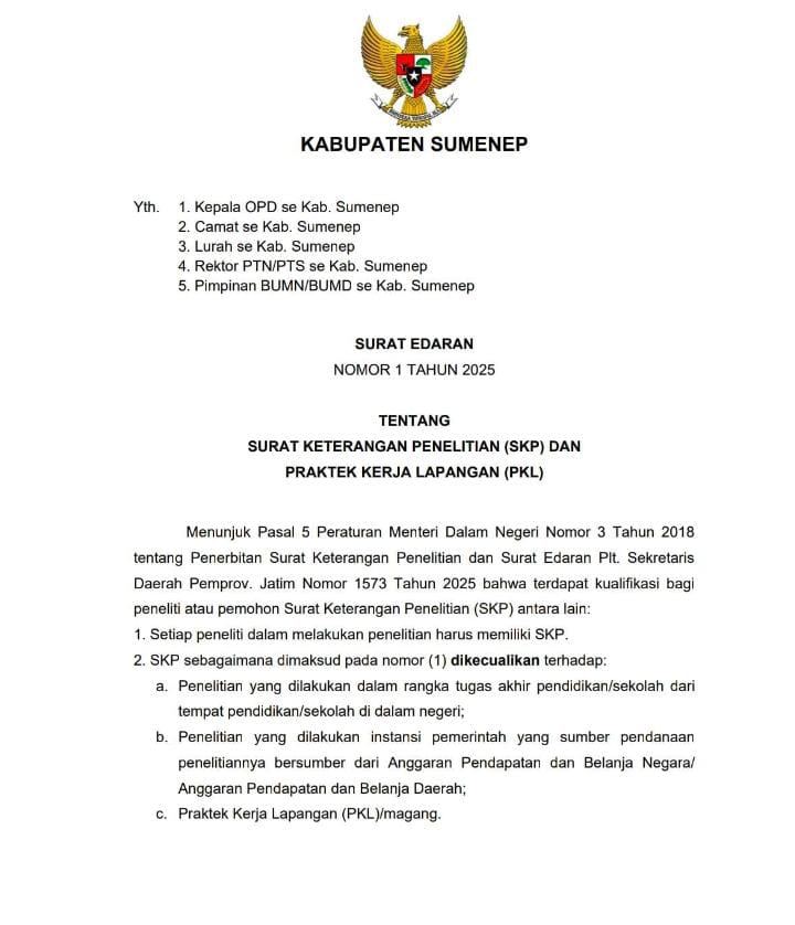 Sumenep | Patroli e- NEWS Pemerintah Kabupaten Sumenep mengeluarkan ketentuan baru bagi para peneliti di kalangan akademik maupun instansi pemerintahan. Ketentuan yang dituangkan dalam bentuk Surat Edaran Nomor 1 tahun 2025 tentang Surat Keterangan Penelitian (SKP) dan Praktek Kerja Lapangan (PKL).