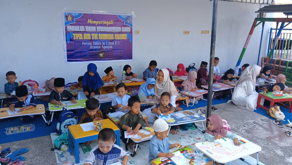 Patroli e-news Dalam rangka memperingati hari besar Islam, Maulid Nabi Muhammad SAW, TPA KB TK Nurul Ulum Perum Zahro In 2 Kramat Nganjuk, Hari ini 4 September 2025 menggelar serangkaian kegiatan yang penuh makna dan keceriaan. Acara yang digelar pada Kamis pagi ini mengusung tema mengingat dan meneladani akhlak mulia Rasulullah SAW melalui aktivitas mewarnai bersama dan tausyiah yang disampaikan oleh guru TK Nurul Ulum.